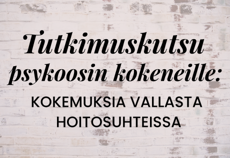 Etsin osallistujia maisteritutkielmaani, joka käsittelee psykoosin kokeneiden ihmisten kokemuksia vallasta psykiatrisissa hoitosuhteissa. Tutkimus toteutetaan Helsingin yliopiston Sosiaali- ja terveystutkimuksen ja -johtamisen maisteriohjelmassa. Tarkastelen työssäni, millaista valtaa hoitosuhteissa on koettu...